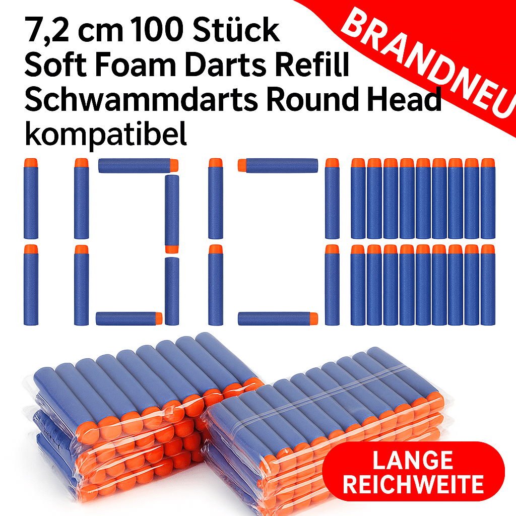 - ✔️ 100 Schaumstoff-Darts in verschiedenen Farben mit oranger Rundspitze