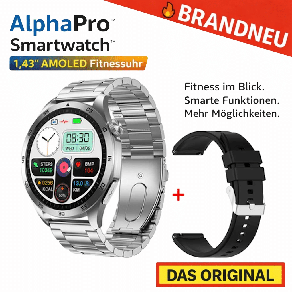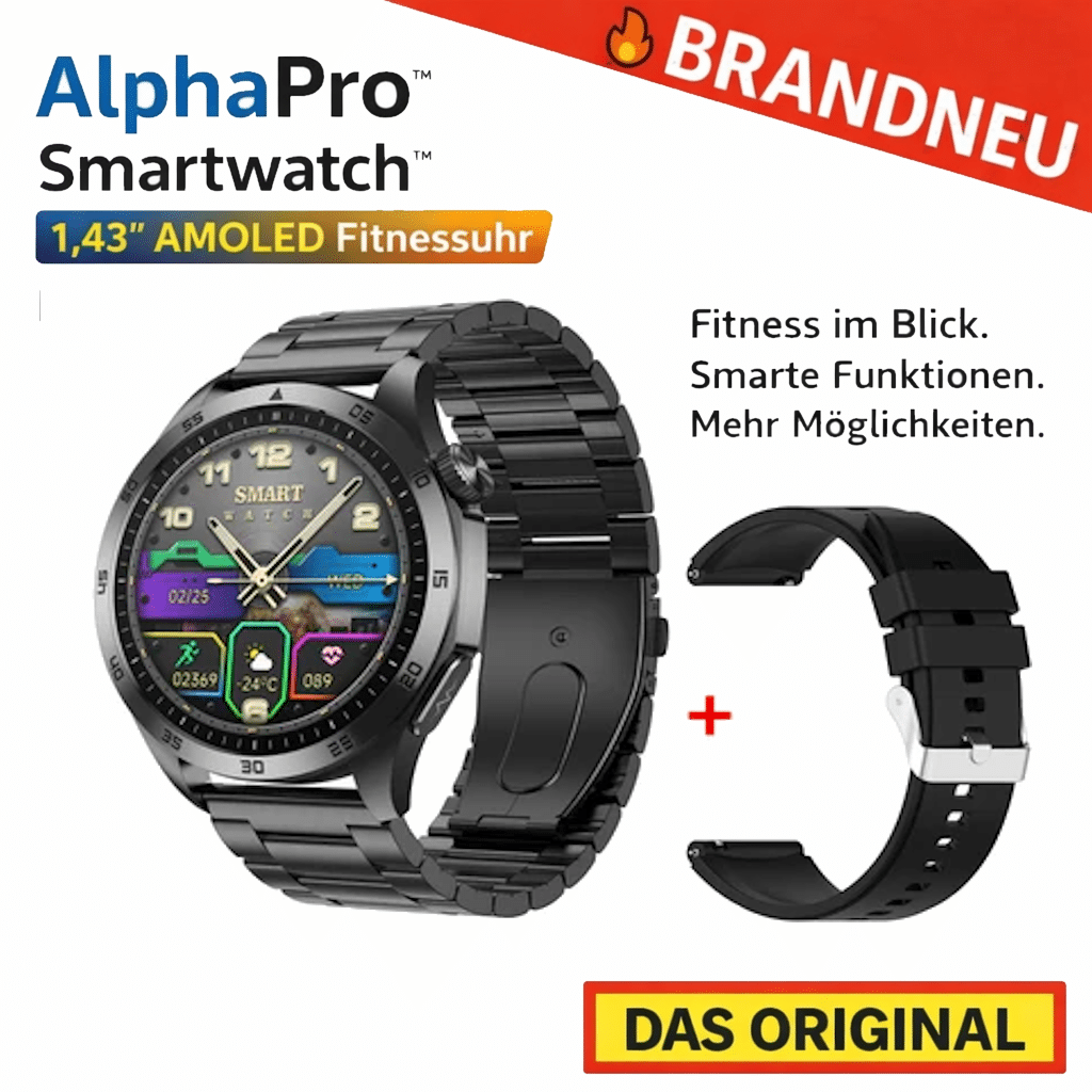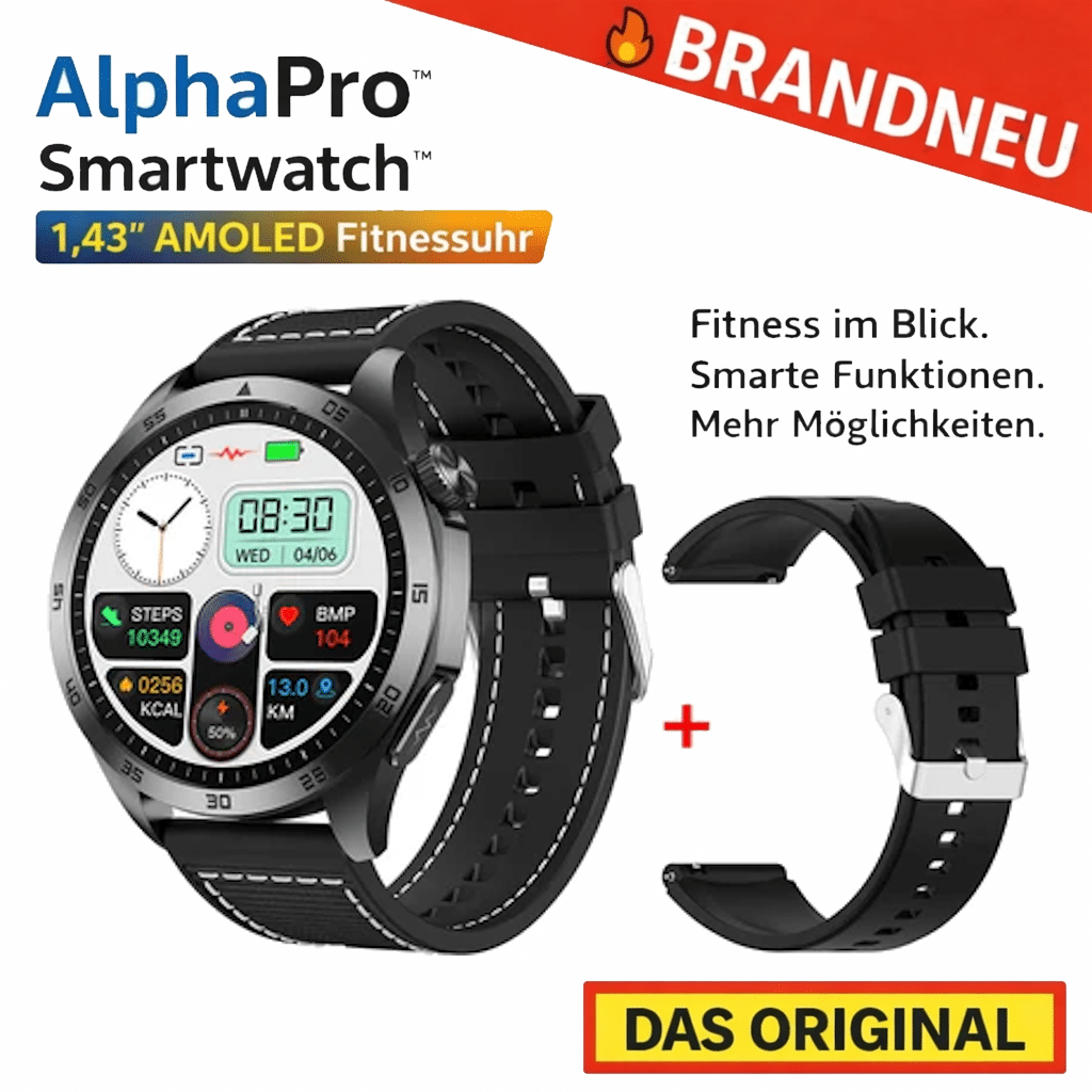 Die AlphaPro™ 1,43″ AMOLED Smartwatch vereint Premium-Design mit modernster Fitness- und Gesundheits­technologie – für Alltag, Business und Training.