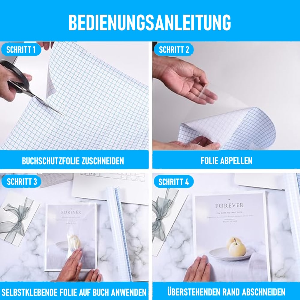 Unser Set enthält alles, was Sie benötigen, um Ihre Bücher zu schützen. Mit einer Schere können Sie die Folie nach Ihren individuellen Bedürfnissen zuschneiden und blasenfrei auftragen. BUCHOX schützt alles!