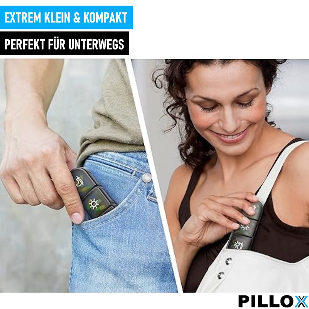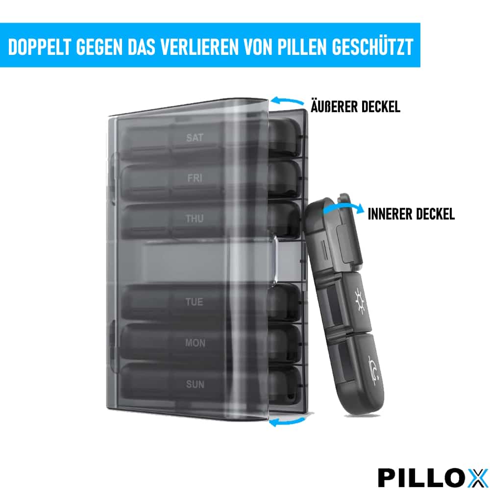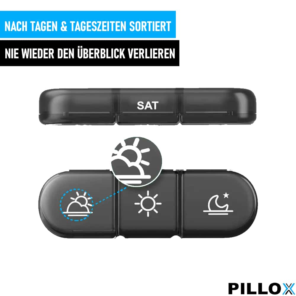 Mit PILLOX können Sie Ihre wöchentliche Pillenration im Voraus planen und organisieren. Jedes Fach bietet sehr viel Platz, sodass Sie Ihre Medikamenteneinnahme für jeden Tag der Woche leicht verfolgen können.