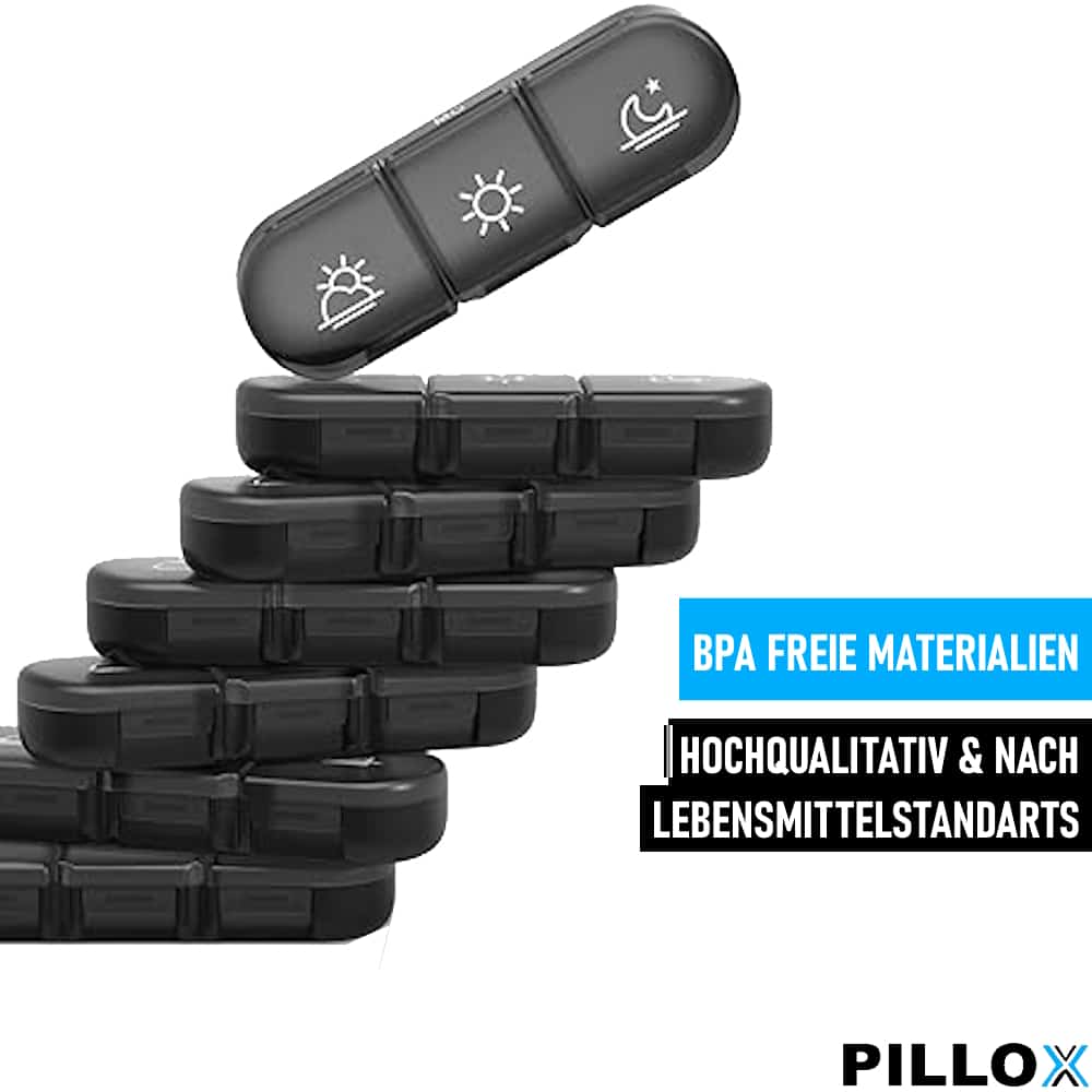 Unsere Tablettenbox besteht aus lebensmitteltauglichen, BPA-freien Materialien, sicher für den täglichen Gebrauch sind. Sie können Ihre Medikamente bedenkenlos in unserer Box aufbewahren, ohne sich um Ihre Gesundheit sorgen zu müssen.