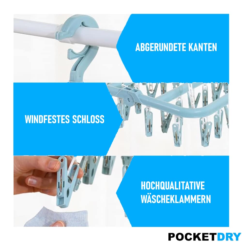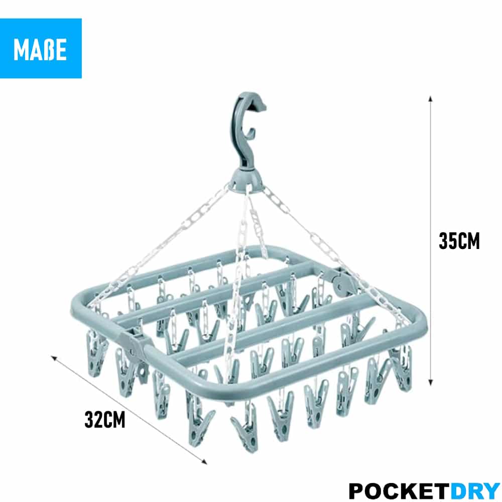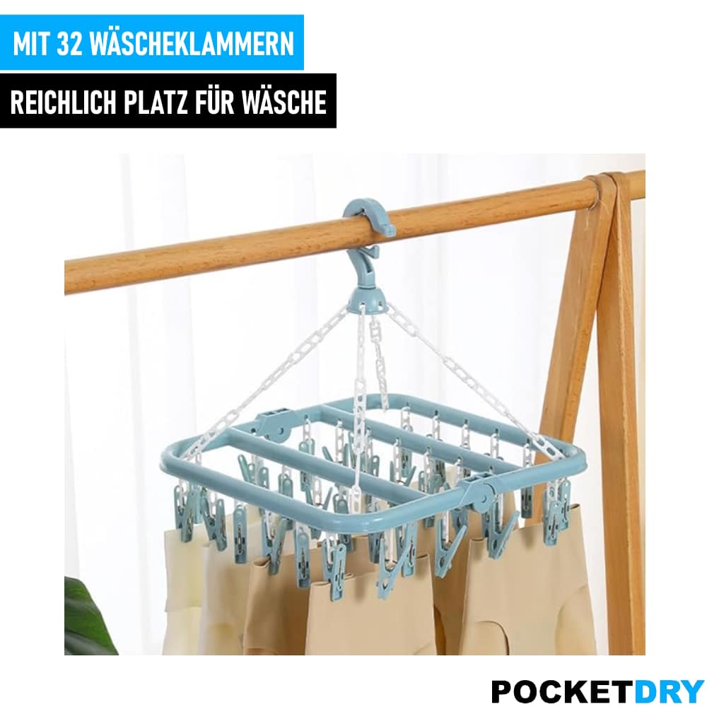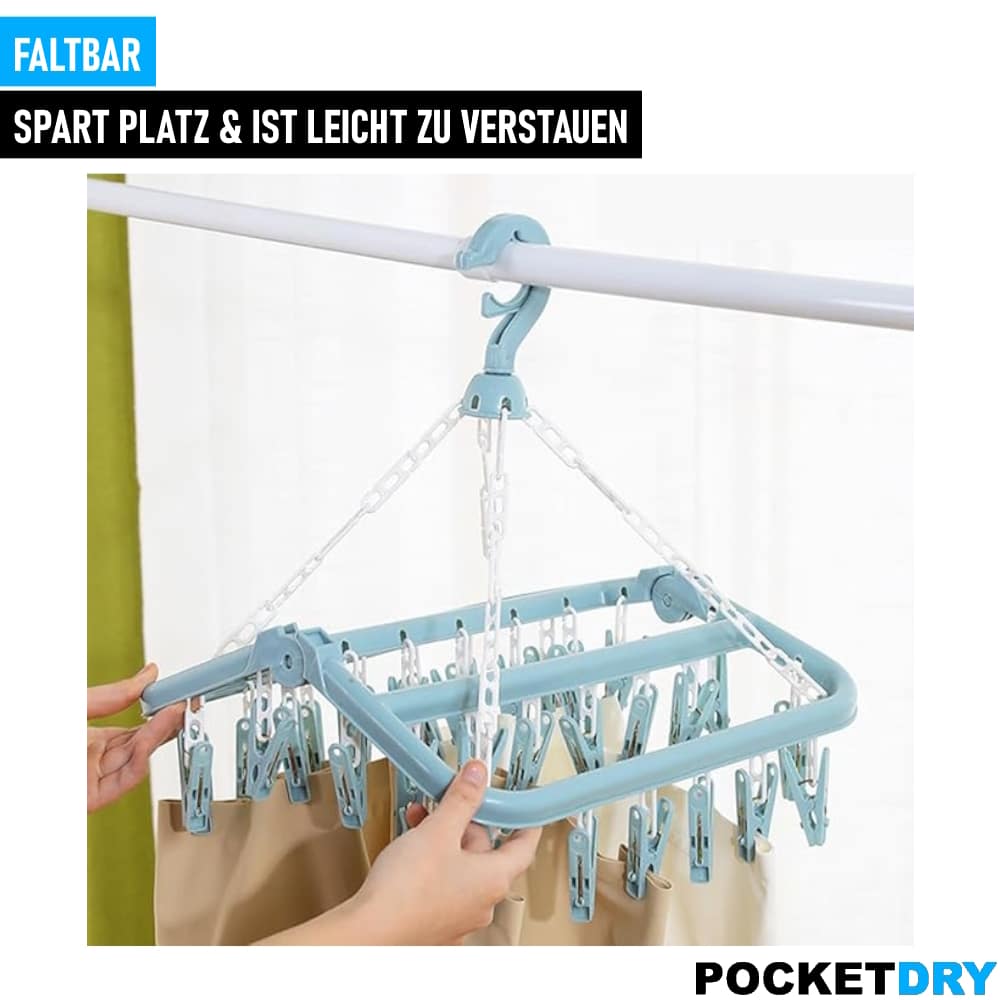 ☑ GROSSES FASSUNGSVERMÖGEN: Mit 32 Clips bietet POCKETDRY ausreichend Platz, um viele kleine Kleidungsstücke gleichzeitig zu trocknen.