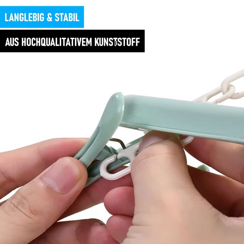 Mit seinen 32 Clips bietet POCKETDRY ausreichend Kapazität, um mehrere Kleidungsstücke gleichzeitig zu trocknen. Das spart nicht nur Zeit, sondern sorgt auch dafür, dass Ihre Wäsche schneller trocknet. Besonders praktisch, wenn es mal schnell gehen muss oder Sie viele kleine Teile gleichzeitig trocknen möchten.