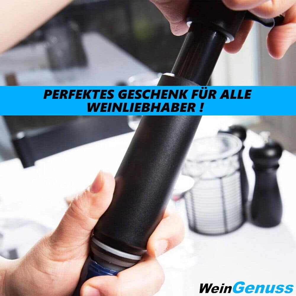 Ein erstklassiger Wein verdient es, in seiner vollen Pracht genossen zu werden. WeinGenuss ermöglicht es Ihnen, den Geschmack und das Aroma Ihres Weins bis zu 10 Tage lang zu bewahren. Durch das Entfernen der Luft aus der Flasche wird Oxidation verhindert, wodurch Ihr Wein länger frisch und köstlich bleibt.